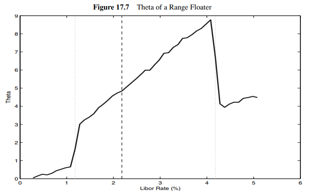 Figure 17.5. Range Floater의 금리민감도 \(\partial V/\partial r\)