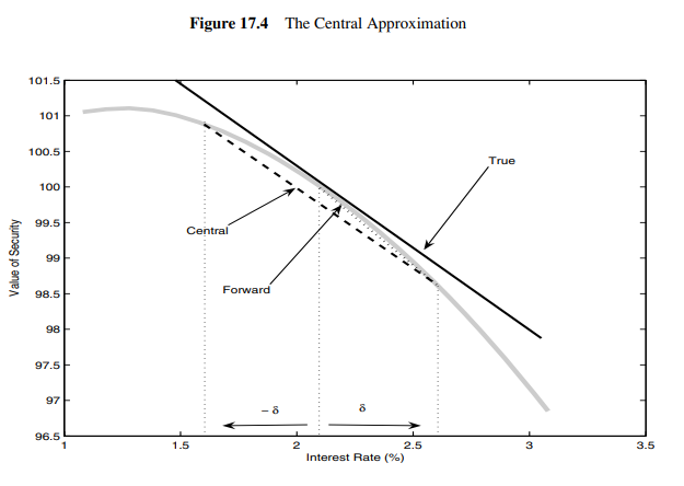 Table 17.2에서 LIBOR 2.08%, 2.18%, 2.28%에 대응하는 가격 100.0651, 99.8385, 99.5966을 사용합니다. LIBOR의 변화를 연속복리 단기금리 \(r\)의 작은 변화로 근사하면 \(\delta \approx 0.001\) 정도이므로