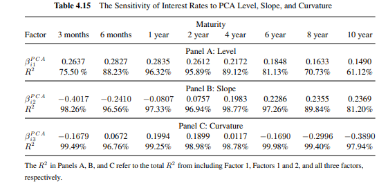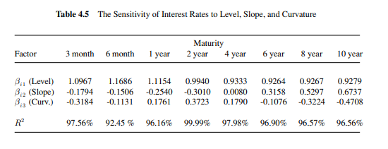 리스크 관리의 핵심 통찰은 표 4.5의 네 번째 행 $R^2$이다. $R^2$는 세 요인이 수익률곡선 각 점의 변화를 얼마나 설명하는지 보여준다. 표를 보면 대부분 만기에서 $R^2$가 매우 높다. 따라서 중요한 함의: