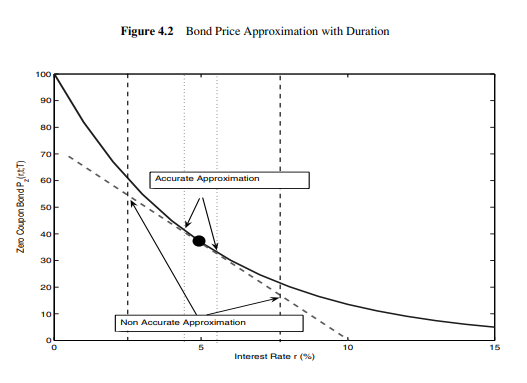 하지만 그림 4.2가 보여주듯, 금리 변화가 상당히 크면, 듀레이션 근사는 그리 좋지 않다. 그림에서 듀레이션으로 구현한 가격 변화 근사는 직선을 따라가지만, 실제 채권 가격은 곡선을 따라간다. 작은 금리 변화에서는 직선과 곡선이 거의 일치한다. 그러나 큰 변화에서는 근사가 꽤 나빠진다.
