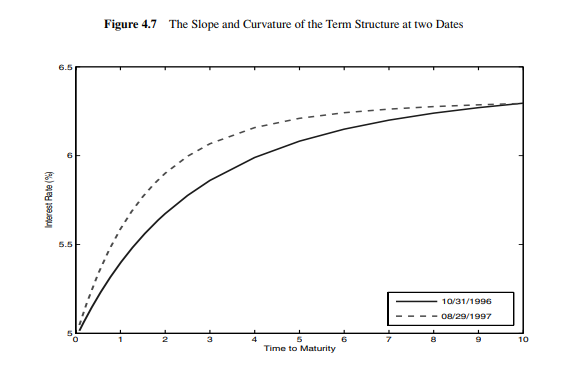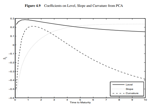 - 실선(첫 요인): 만기별 계수가 거의 비슷 → “수준(level)” 요인이라 부른다. (PCA에서는 계수 제곱합=1 제약 때문에 표 4.5보다 계수 레벨이 작아 보일 수 있는데, 이는 정규화/스케일 문제다.) 이 점에서 PCA 수준 요인은 “가정”이 아니라 “통계 결과”다.