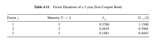 - 표 4.11: 3년 제로쿠폰채의 요인 듀레이션 계산. 표 4.10의 3년 만기 열을 가져와 만기 $T_i=3$을 곱해 $D_{(z,j)}(3)$를 만든다.