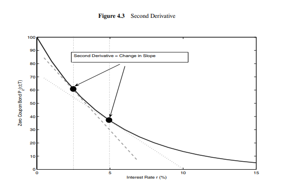 그림 4.3의 2차 도함수 개념과, 그림 4.2의 듀레이션 근사 문제를 합치면, 채권 가격 함수의 2차 도함수를 알면 금리 변화로 인한 가격 변화 근사의 정밀도를 높일 수 있음을 알 수 있다.