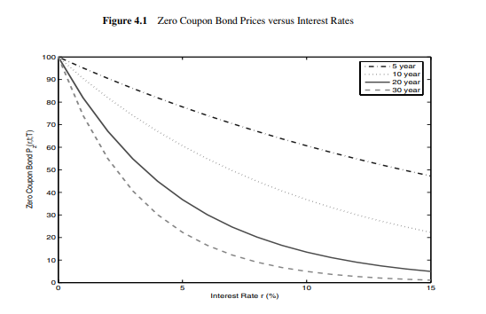 그림 4.1은 이 금리들에 대해 만기 5년, 10년, 20년, 30년의 제로쿠폰채 가격을 그린 것이다. 금리 $r$이 올라갈수록 제로쿠폰채 가격은 내려가며, 금리가 점점 높아질수록 가격곡선은 점점 더 평평해진다(기울기가 완만해진다). 이 패턴은 특히 만기가 긴 제로쿠폰채에서 두드러진다.