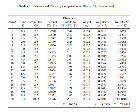 원문 표는 “각 지급시점 현금흐름을 할인해 현재가치 비중 $w_i$를 만들고, $w_iT_i$ 합이 듀레이션, $w_iT_i^2$ 합이 컨벡서티(정확히는 식에 맞는 형태)”임을 보여준다. 표의 최종 결과는:
